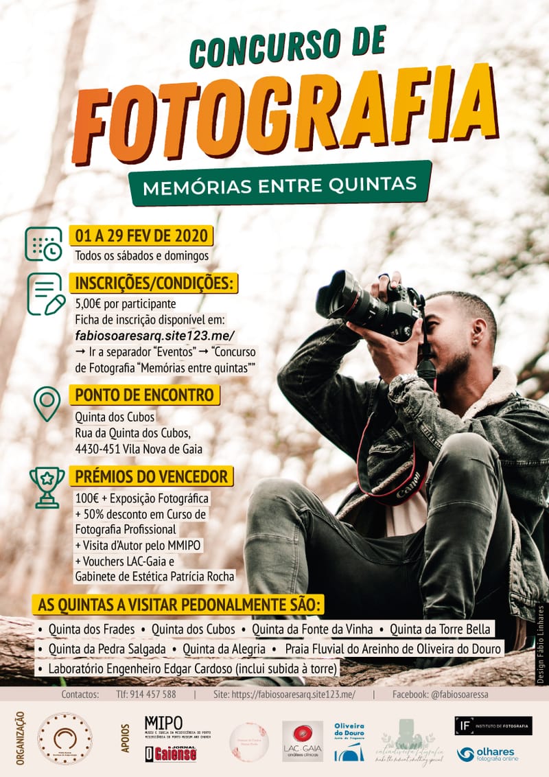 O concurso de fotografia "Memórias entre quintas" é realizado no âmbito do Dia Europeu da Criatividade Artística (21 de março de 2020), na freguesia de Oliveira do Douro, concelho de Vila Nova de Gaia, durante todos os sábados e domingos do mês de fevereiro de 2020, estando aberto à participação do público em geral. Este concurso é organizado pela Fábio Soares - Serviços de Arqueologia em parceria com a Junta de Freguesia de Oliveira do Douro, o Olhares Fotografia Online e Academia Olhares, o Instituto de Fotografia, o MMIPO - Museu e Igreja da Misericórdia do Porto, o Jornal O Gaiense, a Cátia Oliveira Fotografia, o LAC-Gaia análises clínicas e o Gabinete de Estética Patrícia Rocha. Para conhecer todas as informações relativas ao concurso deve consultar o Regulamento e as Condições de Participação. Participe e faça história!